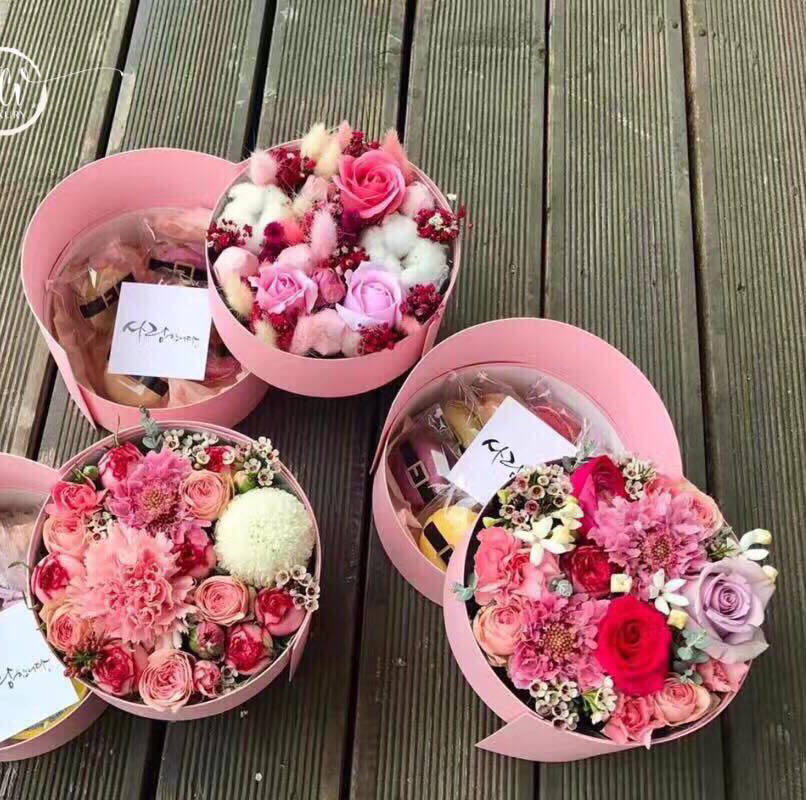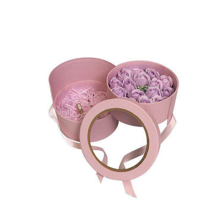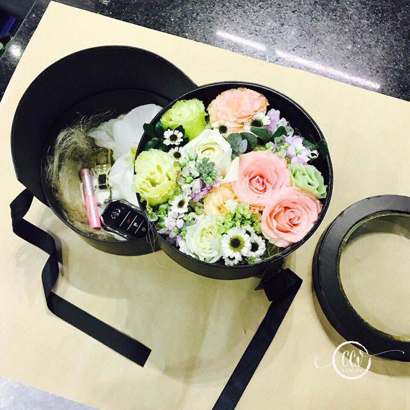 Hộp tròn 2 tầng với thiết kế độc đáo, mới lạ có thể vừa đựng quà và vừa cắm hoa với 4 màu: hồng, đen, trắng, đỏ.